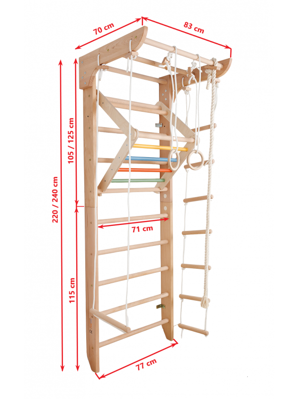 - Capacité de charge : Barres jusqu’à 150 kg | Barre supérieure jusqu’à 100 kg | Barre amovible pour enfants jusqu’à 50 kg | Éléments suspendus jusqu’à 60 kg