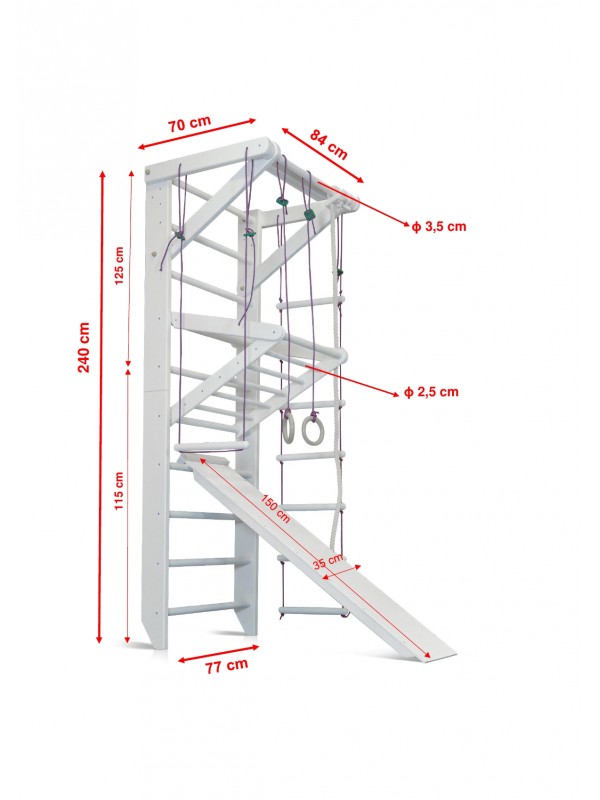 - Charge maximale de l'échelle jusqu'à 140 kg, barre supérieure jusqu'à 100 kg, barres pour enfants amovibles jusqu'à 50 kg, éléments de suspension jusqu'à 60 kg
