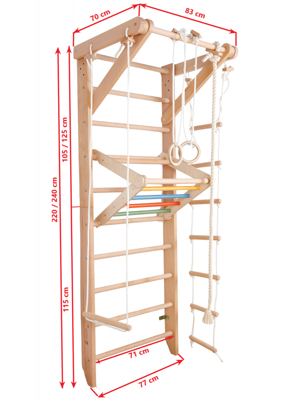 - Capacité de charge : Barres jusqu’à 150 kg | Barre supérieure jusqu’à 100 kg | Barre enfant détachable jusqu’à 50 kg | Éléments suspendus jusqu’à 60 kg.