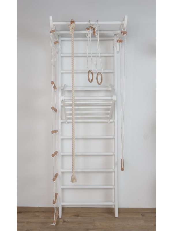 Vous recherchez un équipement d'entraînement élégant et fonctionnel qui ravira enfants et adultes ? Notre échelle murale blanche avec accessoires allie qualité supérieure, design intemporel et polyvalence. Fabriquée en Europe à partir de bois de hêtre massif et revêtue de revêtements HIDROHEL blancs adaptés aux enfants, elle s'intègre parfaitement dans tout intérieur. Sa conception compacte la rend idéale pour une chambre d'enfant, une salle de jeux ou le salon. Un seul produit fournit à la fois une station d'entraînement pour adultes et une structure d'escalade pour enfants.